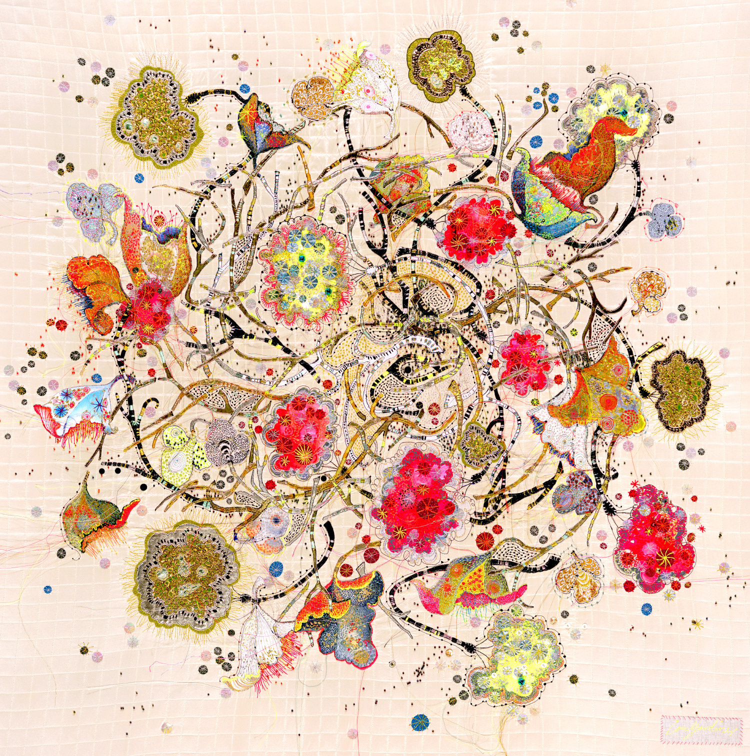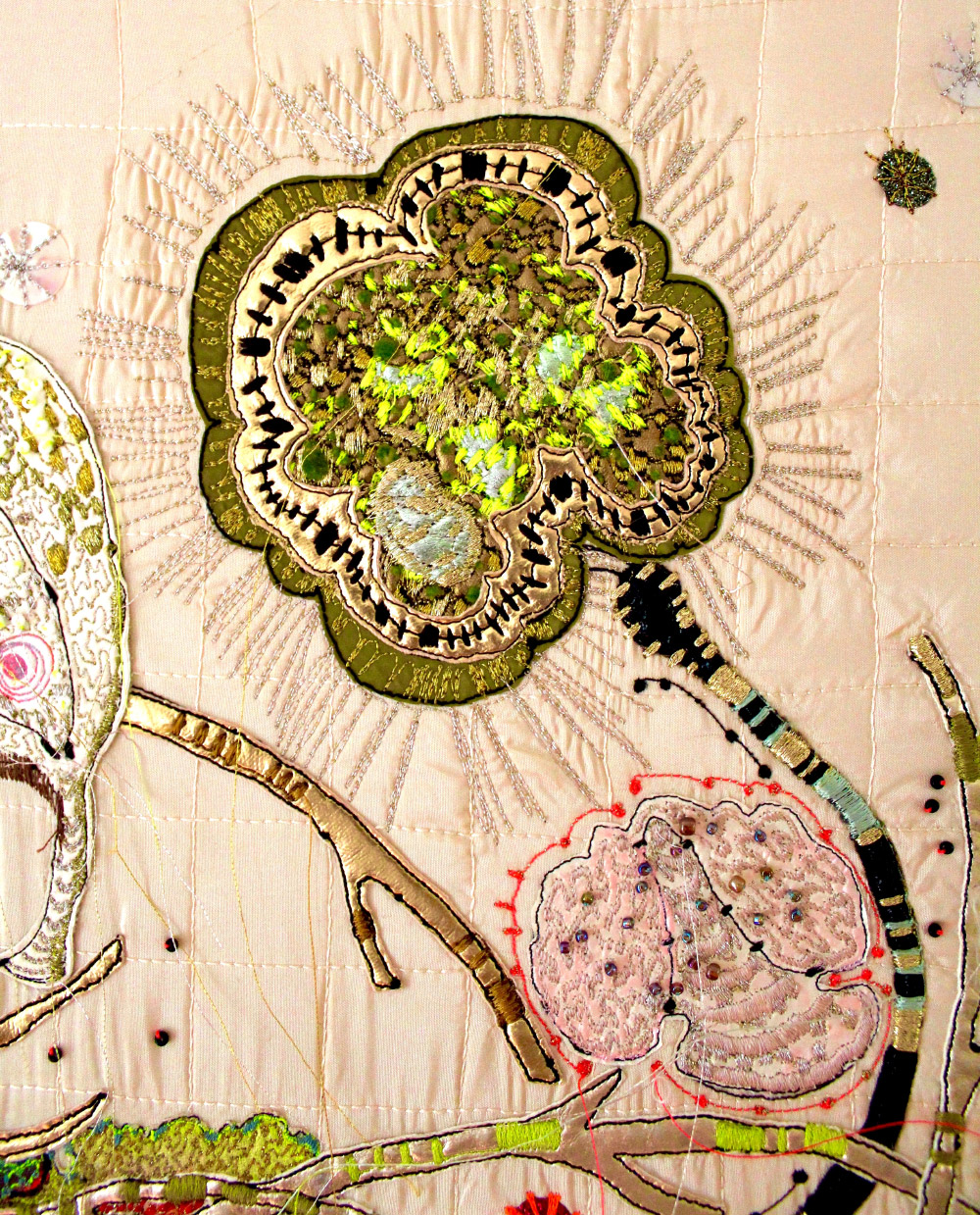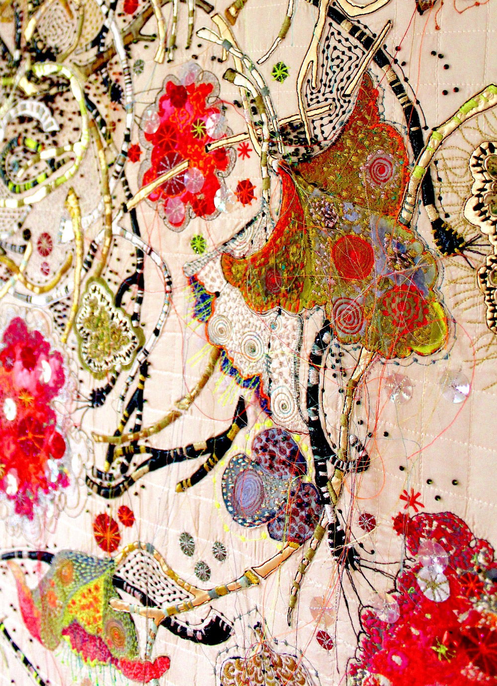 The 5th of an embroidered series for COLLECT at The Saatchi Gallery this highly detailed piece quite literally had bells on it. A swirling relaxed and colourful plant creature which sold with 2 other of the series to a collector in :London.
