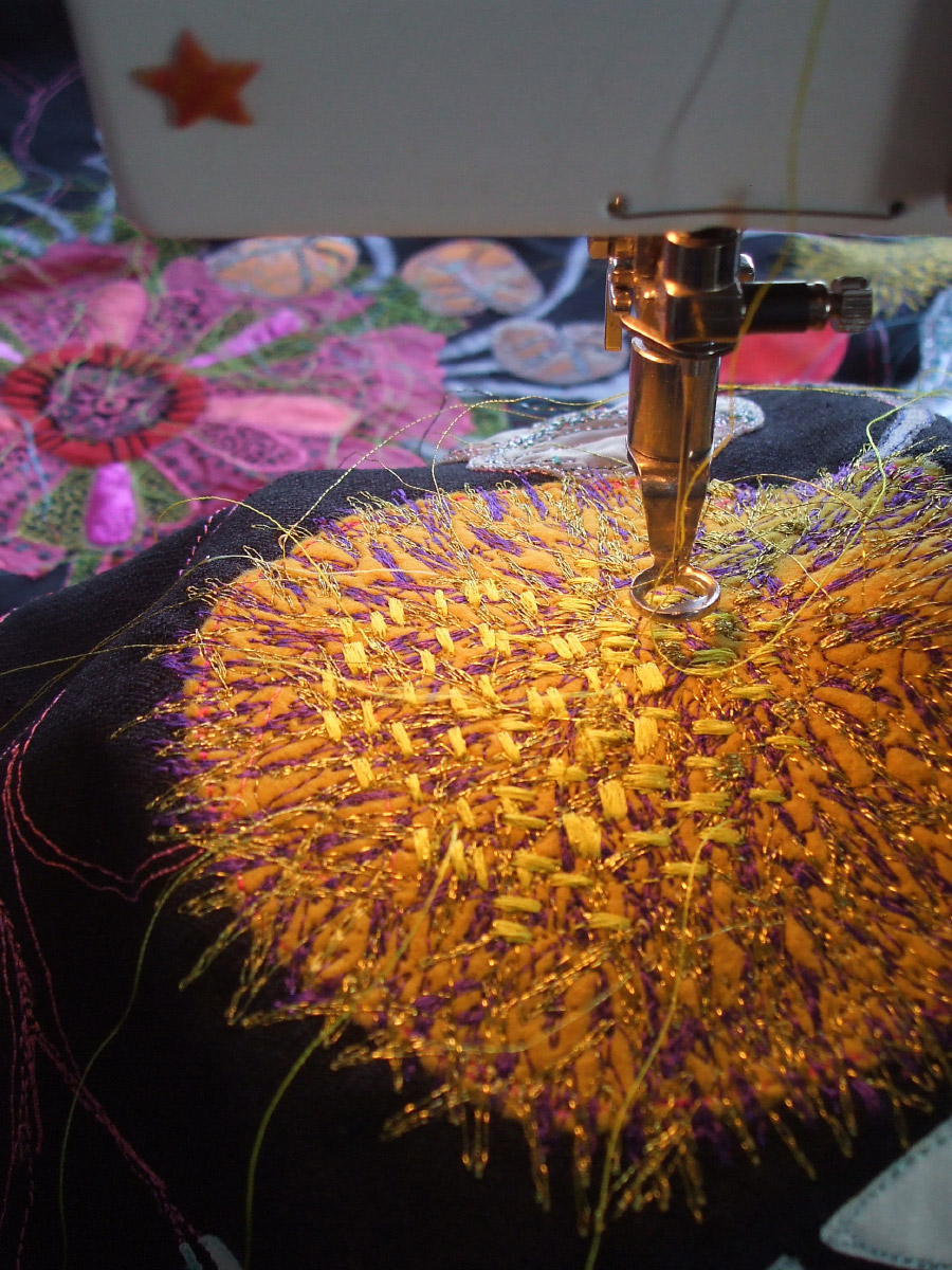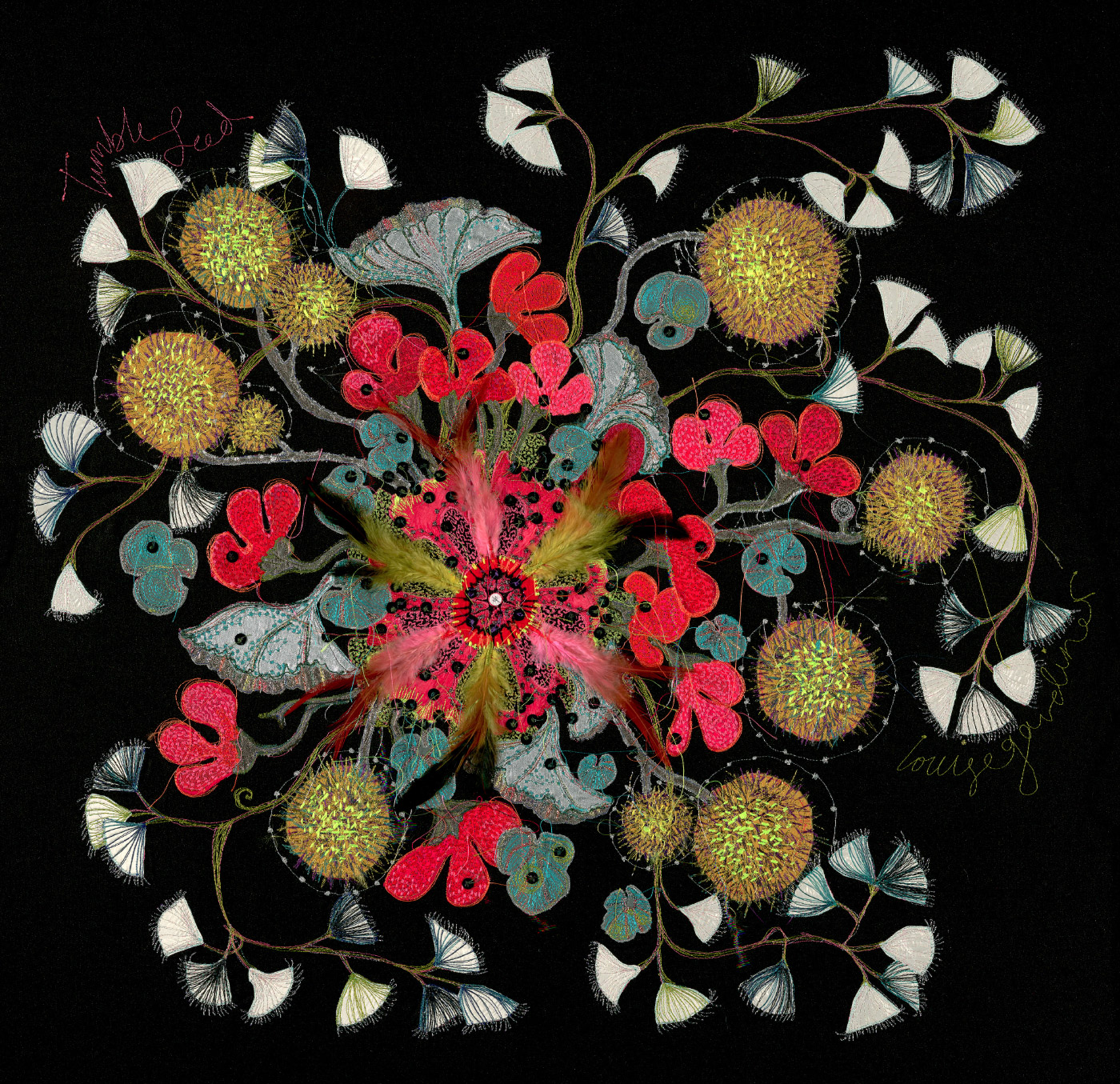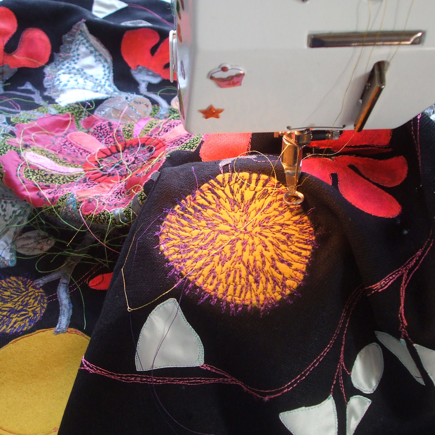 A black linen piece with bright yellow, neon and high vis fabric embroidered flowers and pompoms. Full of joie de vivre and sold at Quarry Bank Mill solo show, Styal.