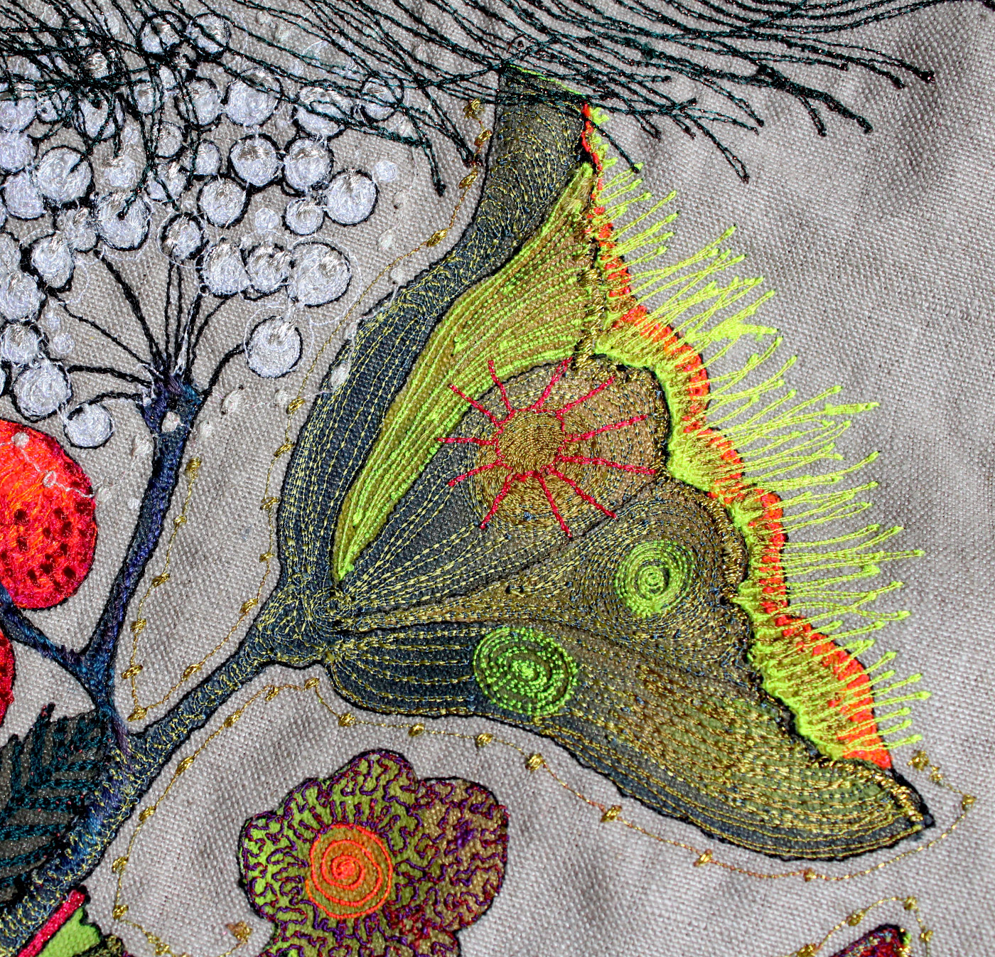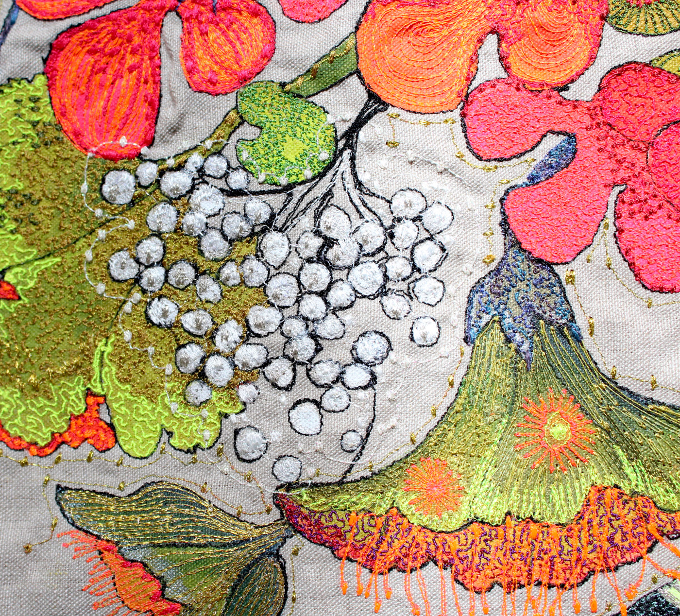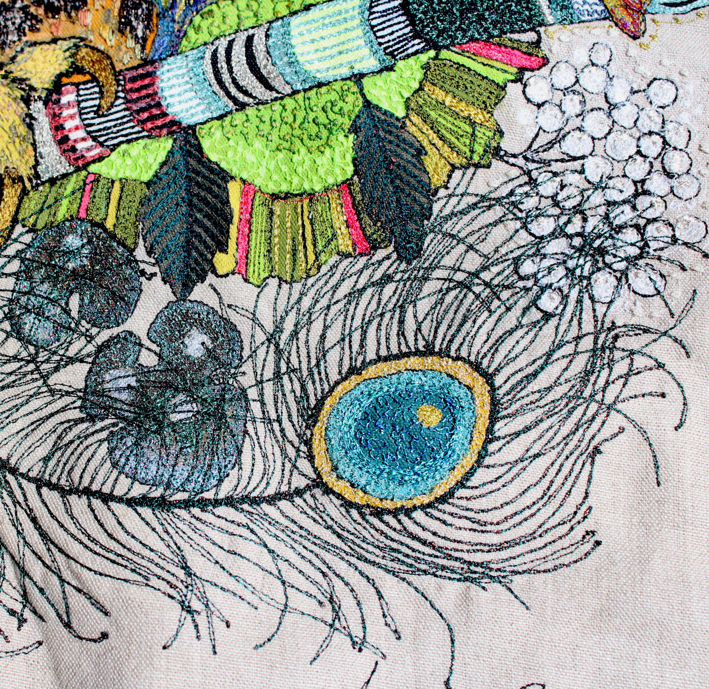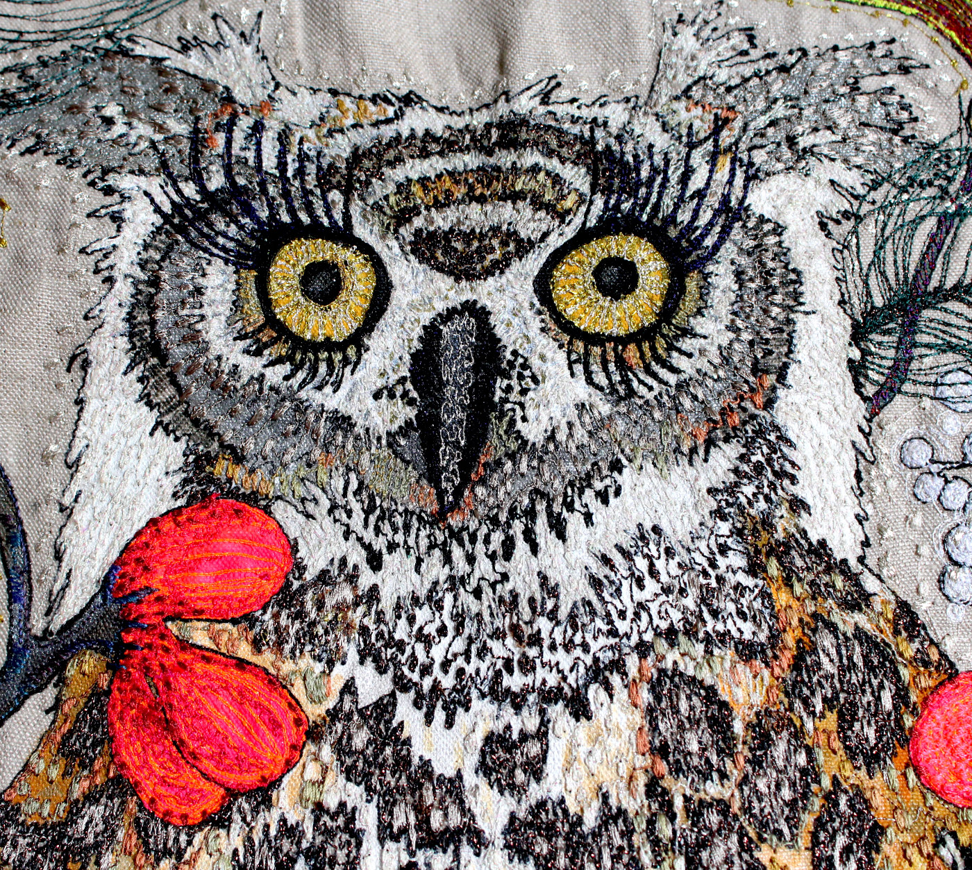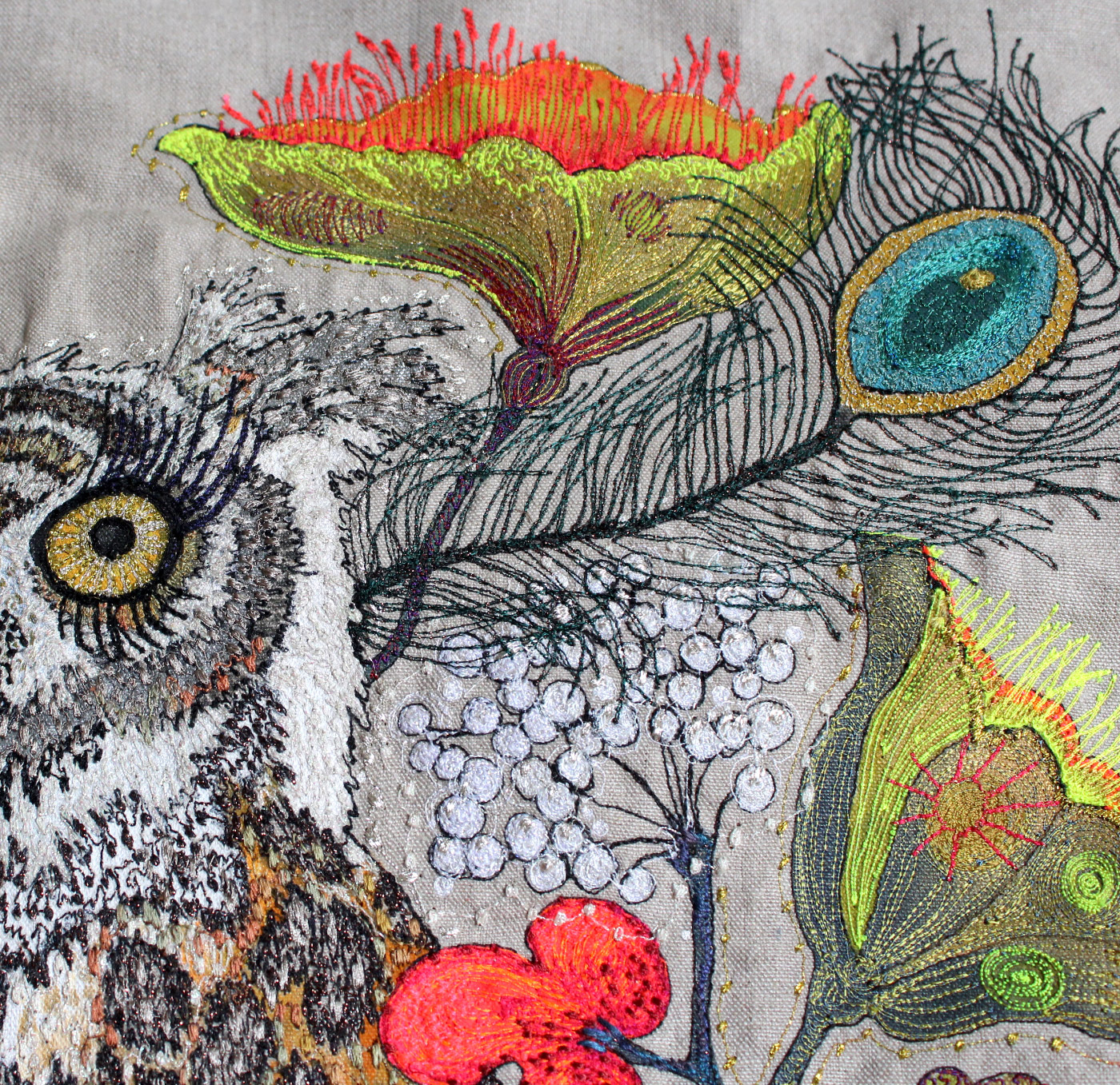 I embroidered this 'Whoo Loves Ya Baby?' owl onto greystone linen which is a beggar to use. Intense painting and embroidered detail were combined to create a really bright and cheerful character for a special lady client who I had met on one of my workshops.