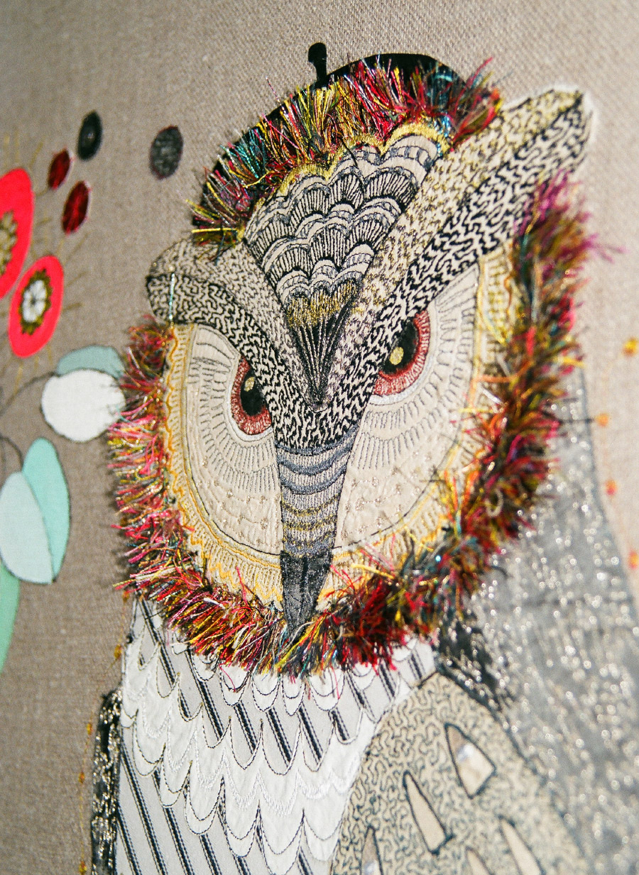 Who's the Daddy - embroidered painted and appliquéd owl on linen.